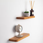 Radius edge shelves have smooth, rounded corners for a softer look, while square edge wall shelves offer a sharp, minimalistic profile β€” both are available in oak and walnut.
